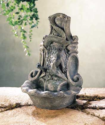 33759 "Squatting Dragon" 33759 -Squatting over a pile of bones, treasure and menacing snakes, a dragon roars to defend his hoard. Alabastrite with pewter finish. 8 3/4" x 6 1/4" x 11" high. $24.95 Item No. 33759 |