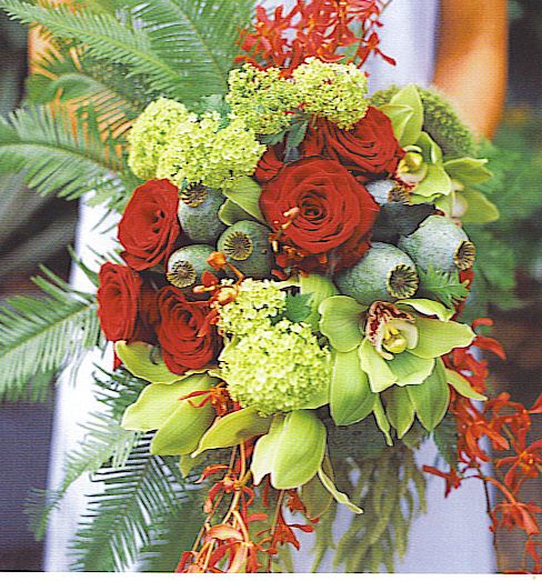 Red Roses, Poppy Seed Heads, & Balls of Viburnum Opulus